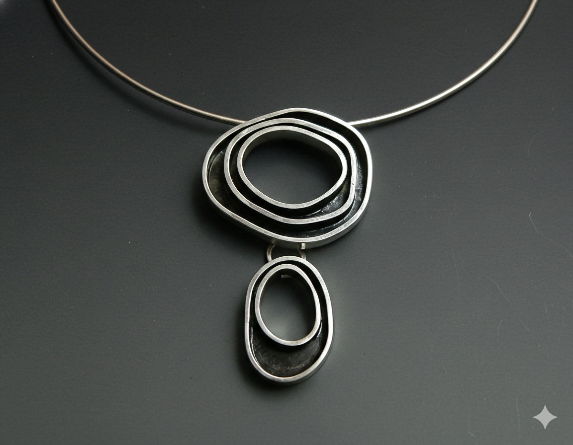 Cada módulo es creado mediante la técnica de micro-fundición y ensamblaje manual. Las capas concéntricas se sueldan con precisión milimétrica para generar una sensación de profundidad y relieve. La pieza atraviesa un proceso de oxidación selectiva en sus cámaras internas para crear un fondo oscuro que resalta el brillo satinado de los bordes superiores, acentuando su carácter escultórico.